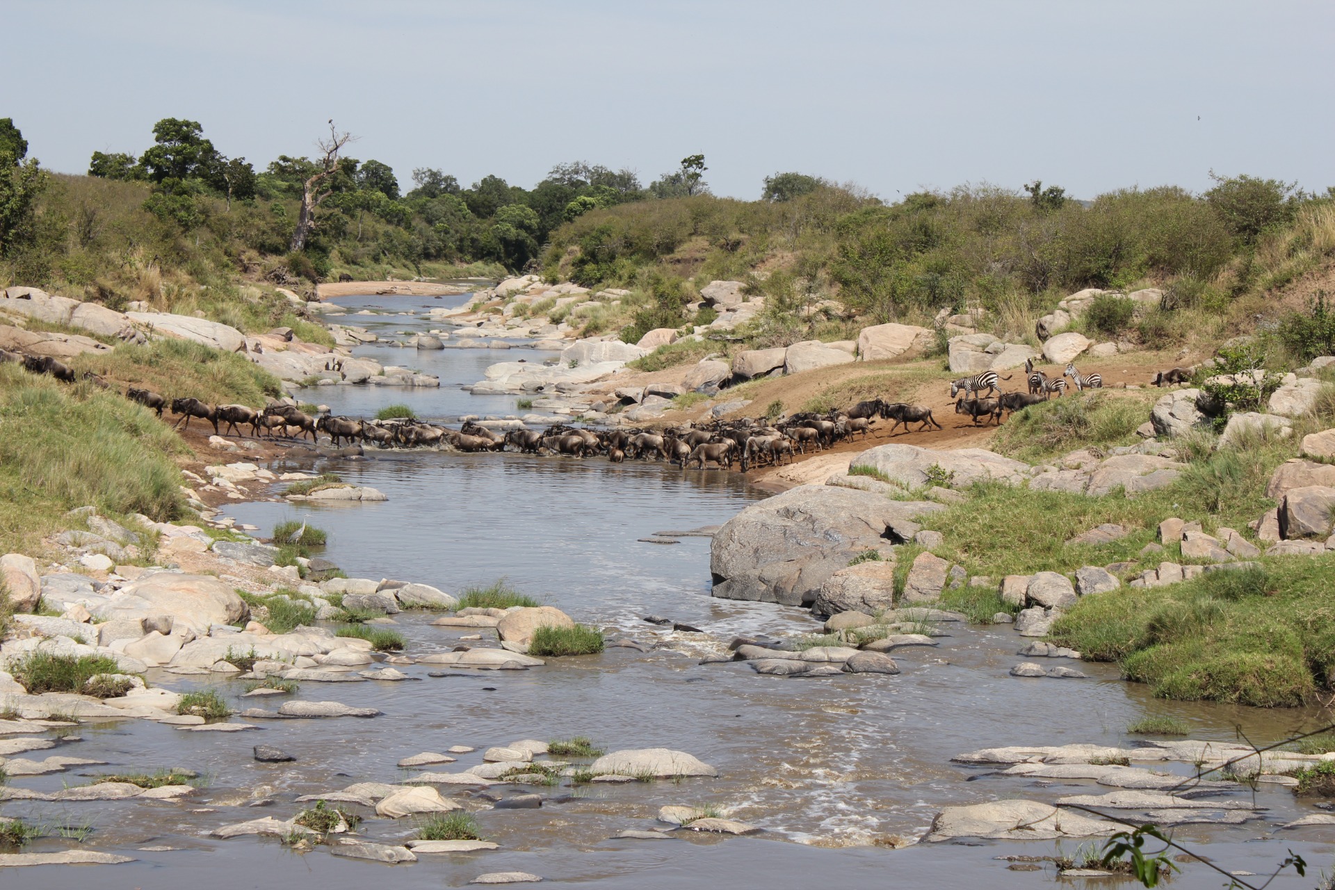 Nähtävänä gnu- ja seepralaumat, mahdollinen joen ylitys